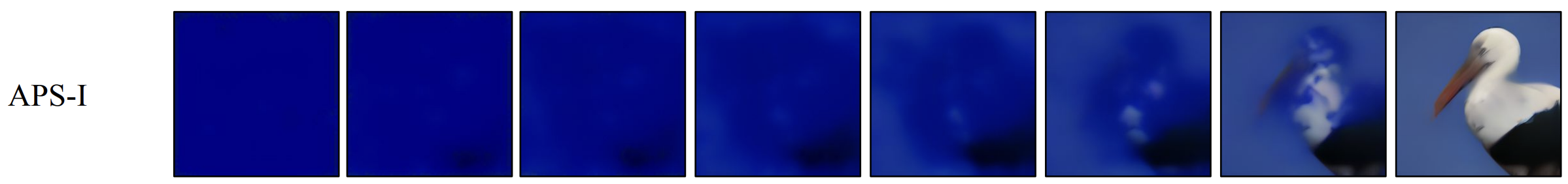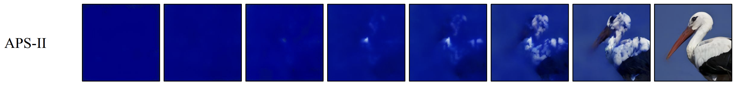 To address this, we compute token confidence using the posterior estimate xφ(zt) rather than the unconditional prior. In this way, anchor tokens identified via quantized expectation are preserved, while low-likelihood background tokens are remasked. Qualitatively, this effect is evident at t = 6/15 in the figure below (APS-II): unlike the standard prior-based strategy (second row), which prematurely unmasks background pixels, our approach commits to anchor tokens aligned with the bird’s body. This ensures that the background (blue sky in the measurement) is correctly downweighted, as it is inconsistent with the prior white background generated by xθ. Subsequent steps therefore refine the image conditioned on these anchor tokens, reducing conditional entropy and producing reconstructions that remain faithful to the measurements.