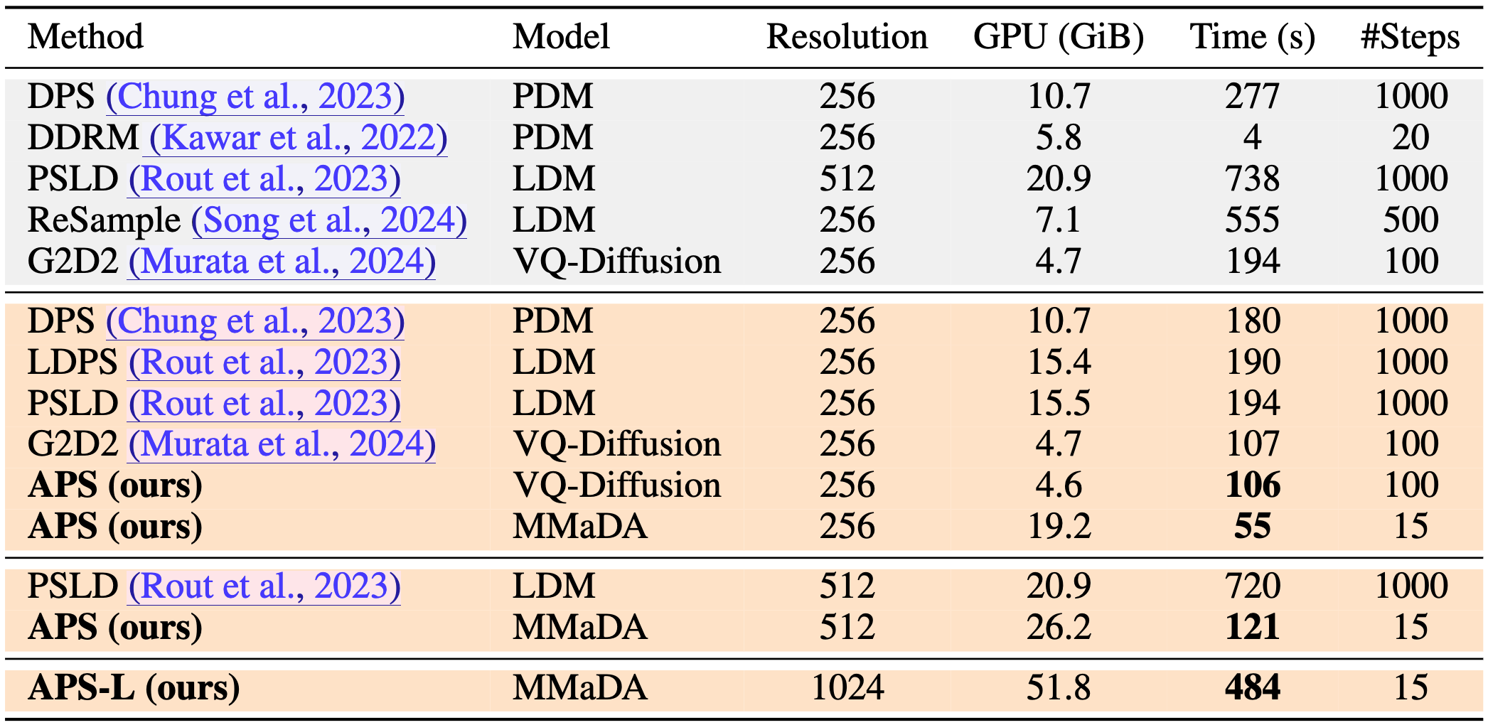 Under the same budget, APS matches or improves G2D2’s runtime while yielding better reconstructions: at 256 × 256 with VQ-Diffusion both methods use 100 steps, but APS yields higher quality (see Table 5); with the stronger MMaDA prior at 512×512, APS achieves consistently better LPIPS/PSNR as discussed in §4. Moreover, our 1024×1024 configuration (APS-L) demonstrates better test-time scaling behavior compared continuous diffusion: we keep 15 steps and still obtain substantial quality gains at reasonable cost (484s).