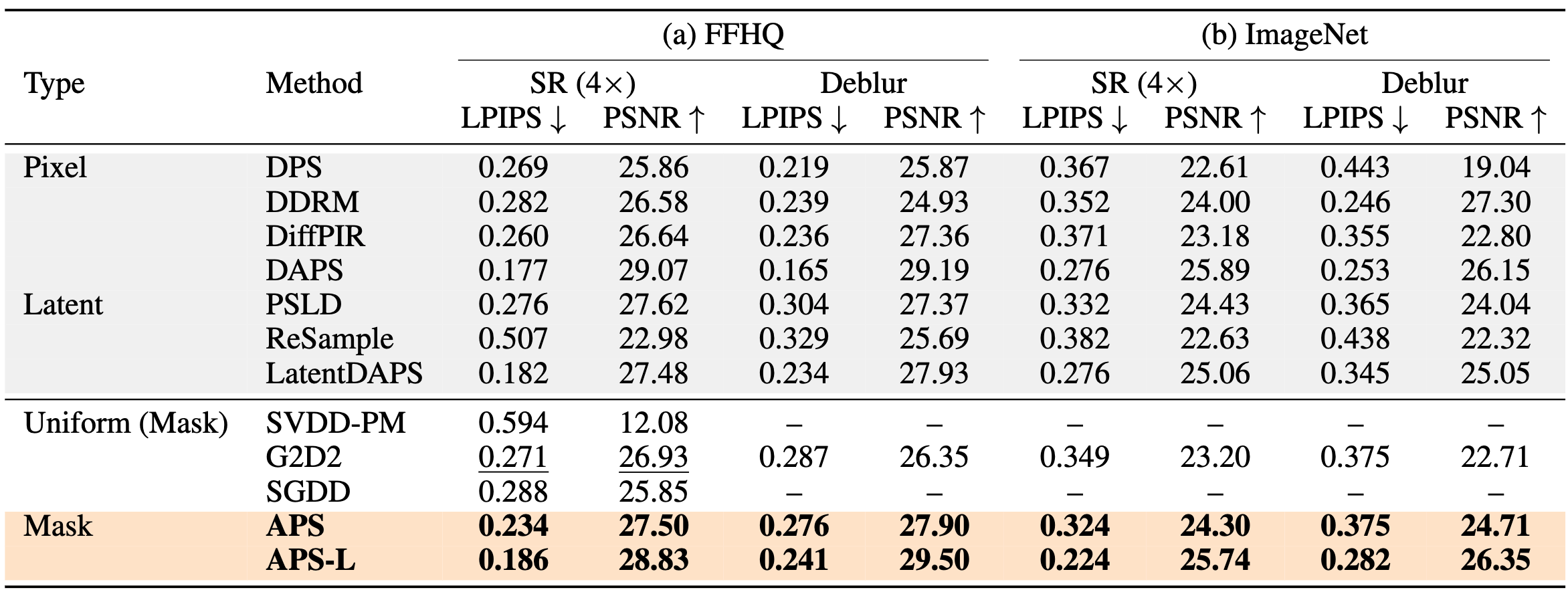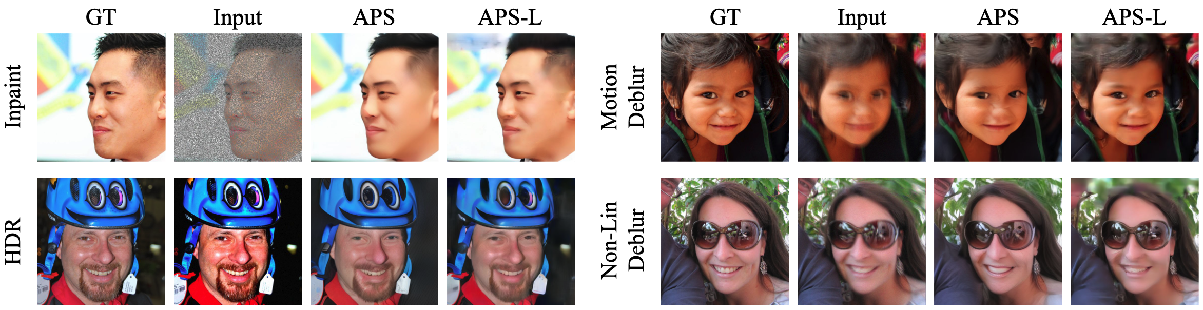 Qualitative results on FFHQ for linear (top row) and nonlinear (bottom row) inverse problems. APS and APS-L recover high-fidelity images from severely degraded inputs.