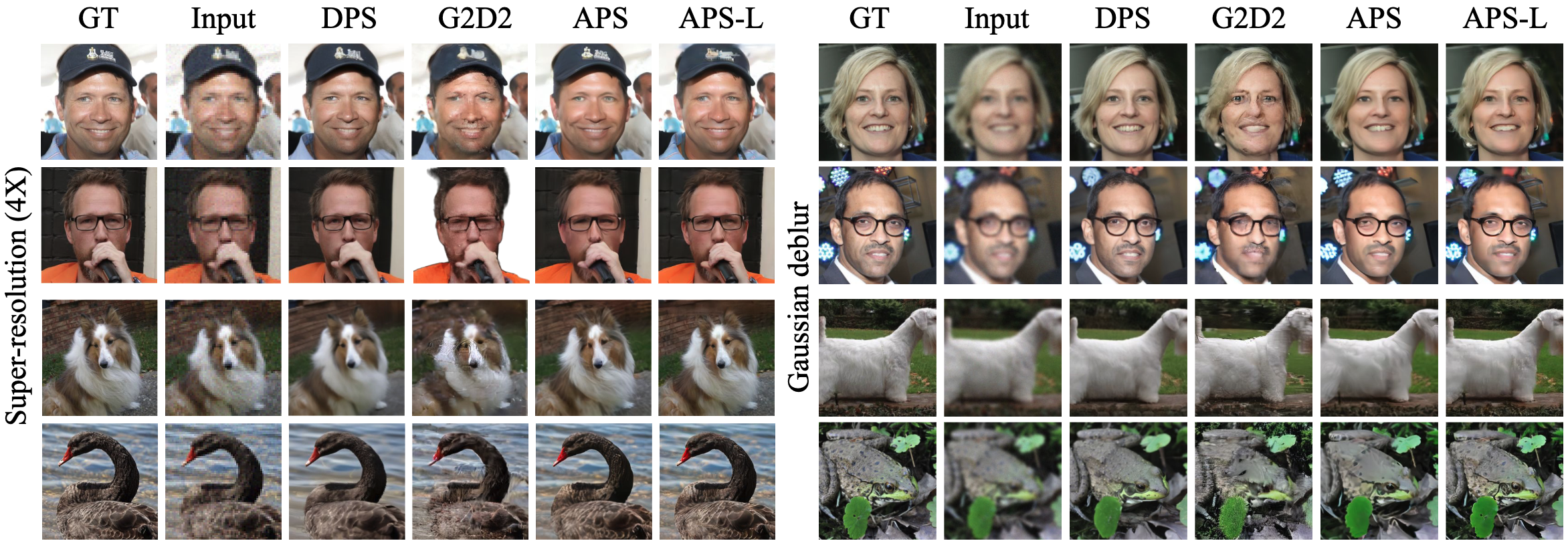Qualitative results on FFHQ and ImageNet for SR (4×) and Gaussian deblur. Compared to DPS and G2D2, APS yields better results with sharper texture and refined facial features. For instance, in the third row, APS reconstructs fine strands of the white and brown dog’s fur.