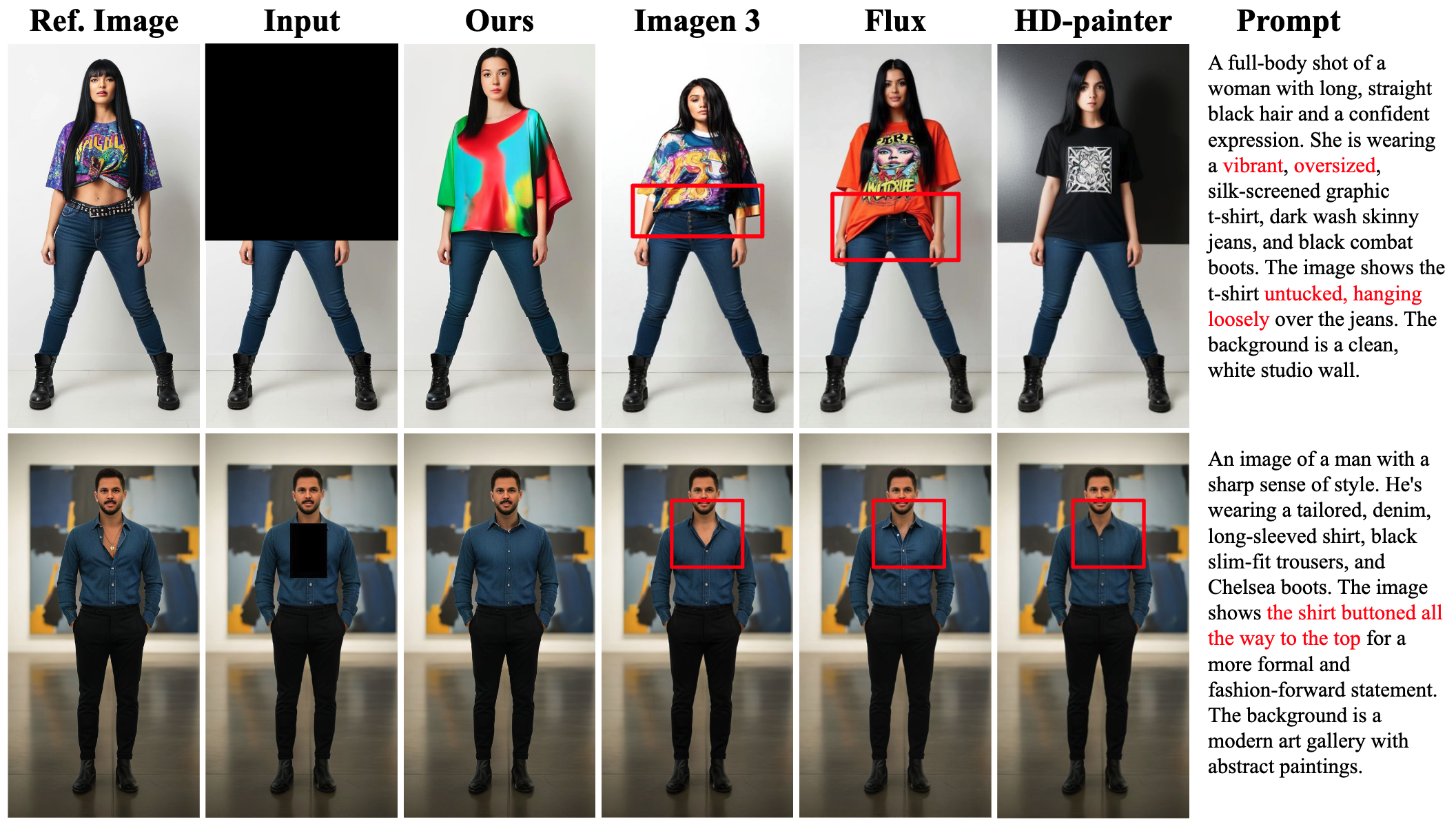 Text-guided block inpainting on high-resolution (1024×512) images. Our approach (APS) generates prompt-aligned garment completions compared to prior methods. Red boxes highlight prompt-misalignment in competing approaches. In the first row, the prompt specifies an untucked, oversized T-shirt with vibrant colors—details missed by Imagen 3, Flux, and HD-Painter. In the second row, our approach correctly buttons the shirt all the way to the top.