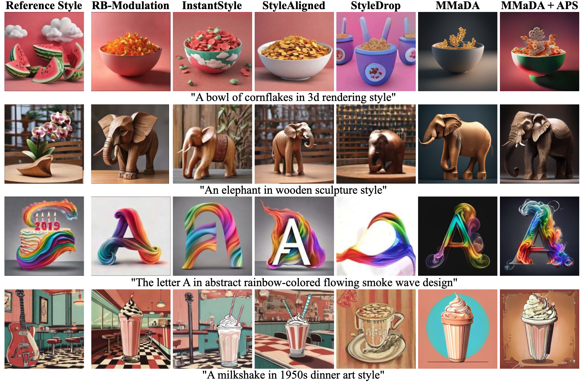 Qualitative comparison on reference-based stylization. We compare our full method (MMaDA + APS) with the base model (MMaDA) and several state-of-the-art contnuous diffusion methods across four style-prompt pairs. For each row, all methods use the same Style Reference image (left) and text prompt (shown below the images).