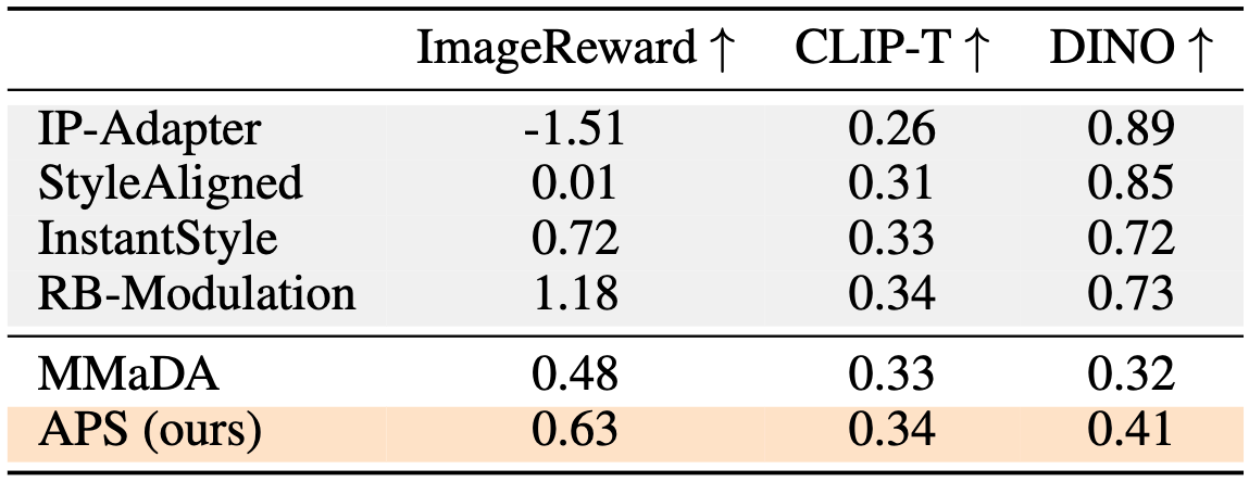 Quantitative results demonstrating that our posterior sampler unlocks stylization capabilities absent in the base model. Notably, APS also surpasses continuous baselines such as IP-Adapter (Ye et al., 2023) and StyleAligned (Hertz et al., 2023) on ImageReward and CLIP-T, despite relying on a weaker generative prior (Yang et al., 2025).