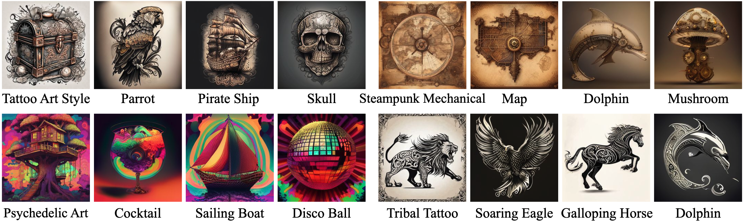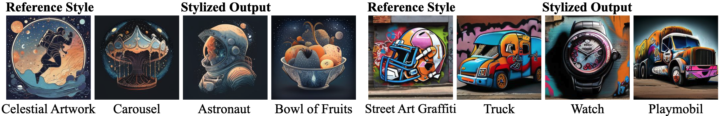 Qualitative results on stylization. For each case, our APS algorithm conditions on a single reference style image together with a text prompt to generate the stylized output images. The prompt follows the template: “Generate an image in [style] style. A [class], high detail, photorealistic.” Here, [style] denotes the reference style (e.g., Celestial Artwork), and [class] corresponds to the label shown below (e.g., Carousel).