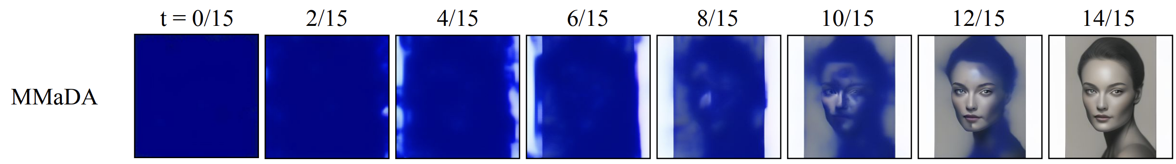 Qualitatively, the figure below illustrates this phenomenon using the discrete diffusion foundation model MMaDA. While the model confidently unmasks background tokens early, the salient object is revealed only much later, highlighting the limitation of standard remasking for posterior sampling.