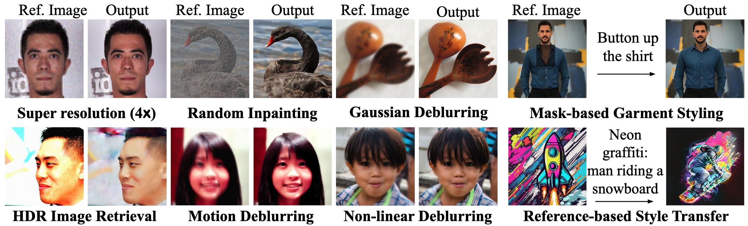 We introduce Anchored Posterior Sampling (APS) for masked diffusion foundation models, built on two key innovations: (i) quantized expectation, which provides gradient-like guidance for discrete diffusion with purely discrete embedding space, and (ii) anchored remasking, which enables adaptive decoding during inference. Our method supports a variety of linear and nonlinear image restoration tasks (left three columns), as well as mask-based garment styling and reference-guided style transfer (last column).