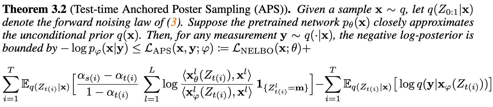 In summary, retraining a new network ϕ for every task would require backpropagation through massive denoisers (e.g., 8B parameters in MMaDA), which is computationally prohibitive. Our theoretical results show that posterior sampling can be done efficiently by reusing the pretrained model and optimizing only lightweight parameters at test time. Next, we introduce two key ingredients—Quantized Expectation (§3.2.1) and Anchored Remasking (§3.2.2)—that make this trainingfree posterior sampling practically implementable. These two ideas together form our Algorithm 1: Anchored Posterior Sampling (APS); please see Appendix B.2 for a detailed discussion.