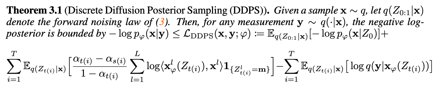 Theorem 3.1 provides a principled training criterion for discrete posterior samplers. The likelihood-based tilt log q(y|xϕ(Zt(i))) enforces measurement consistency When y is absent, the tilting terms vanish and the objective reduces to the standard masked diffusion NELBO (5). The negative cross-entropy term is zero for unmasked tokens and gets supervision for masked tokens, with weights determined by the noise schedule.